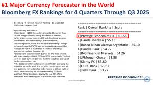 Bloomberg News issued multiple top rankings for Jason Schenker’s FX forecasts for Prestige Economics through the end of Q3 2025: