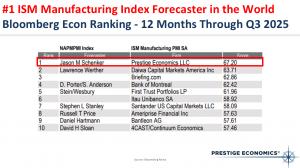 These Bloomberg economic indicator rankings are based on forecasts made throughout the 12 months ending with the close of Q3 2025. This was the second consecutive quarter in which Mr. Schenker was ranked the #1 ISM Manufacturing Index Forecaster in the World.